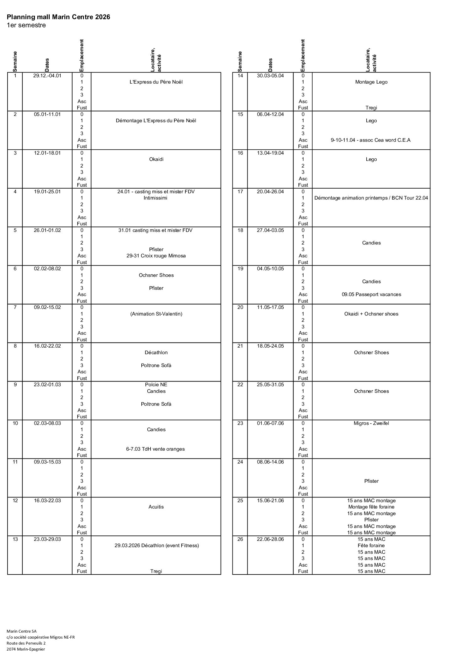 Pour toutes réservations de malls, merci d’envoyer un e-mail à centrescommerciaux@migrosnf.ch Merci de préciser les dates qui vous intéressent et le mall en question. Plans des malls Situation des réservations des malls au 25.02.2026 Plans des malls