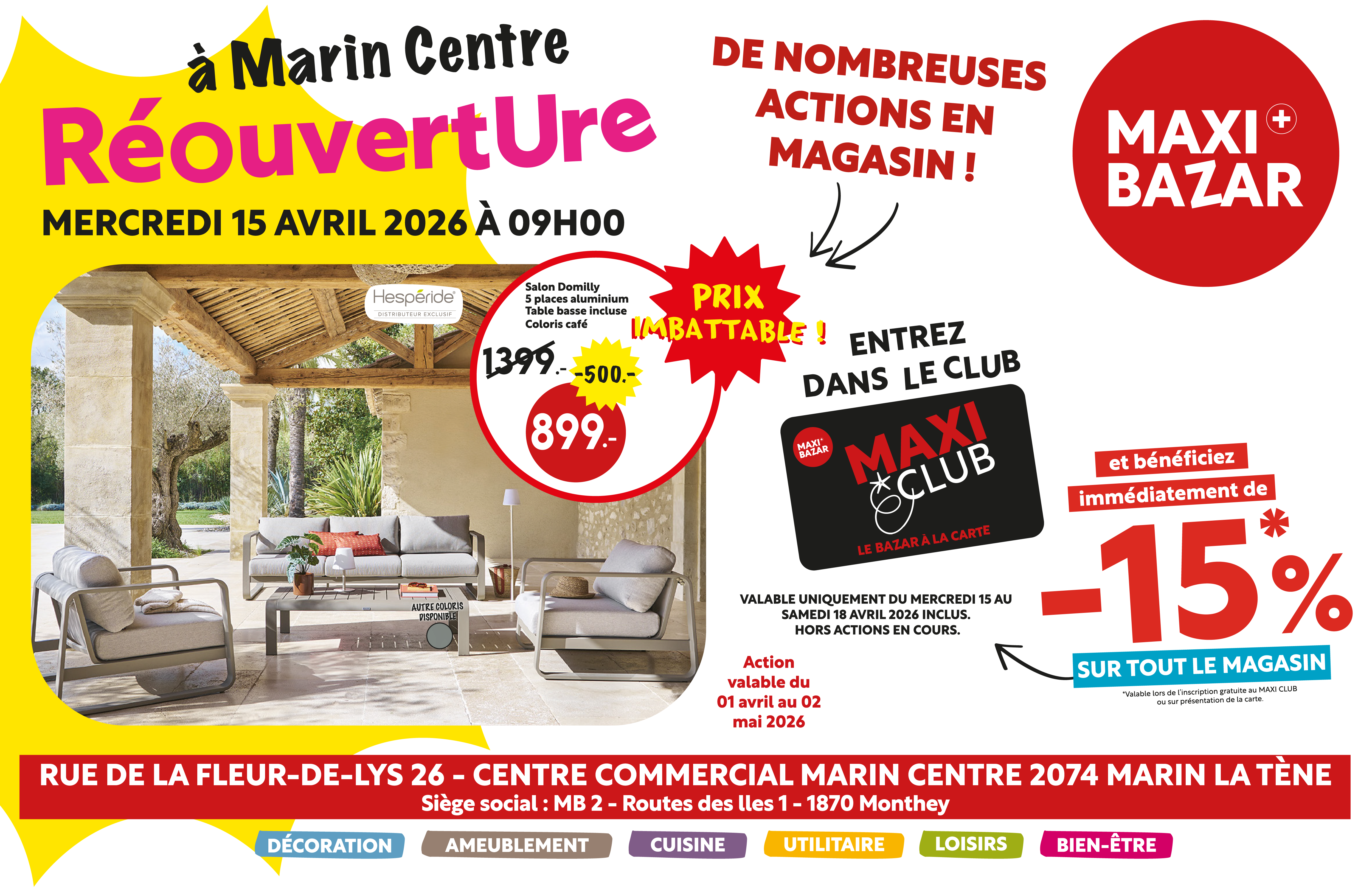 À l’occasion de l’ouverture de votre nouveau Maxi Bazar, profitez de -15% sur TOUT le magasin* ! Découvrez également de nombreuses actions** en magasin, comme le salon de jardin Domilly à 899CHF soit 500CHF de rabais !